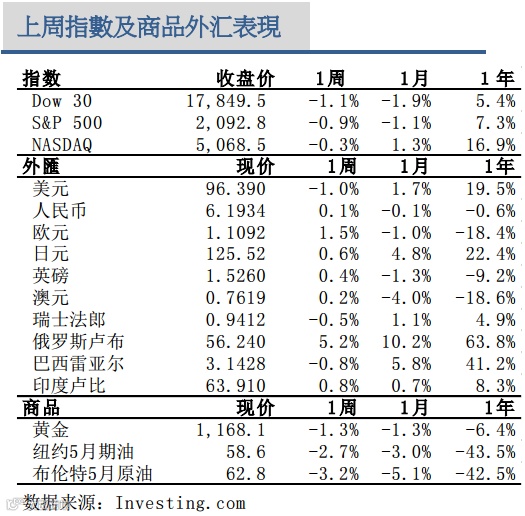 异动板块 金融股表现最佳,摩根大通股价创历史新高,银行股亦普遍逆市走高,为上周表现最佳板块;公用事业股遭投资者抛售,一周急挫4%。本周中概股表现强劲,中国股市再创七年高点,带动在美上市的中概股逆市走高,平均一周涨幅约3.6%,远胜大市表现。