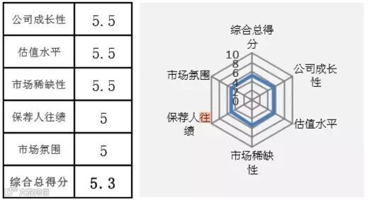 综合评分总得分 =(市场氛围评分 + 公司成长性评分 + 估值水平评分 + 市场稀缺性评分+保荐人往绩评分)之平均数