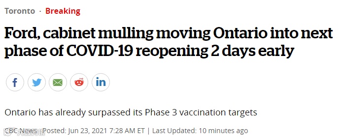 CBC新闻今早报道,据消息来源称,省长福特和内阁成员正在考虑安省于6月30日下周三进入第二阶段重启,比预期提前2天。