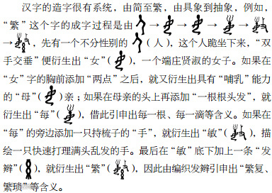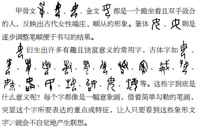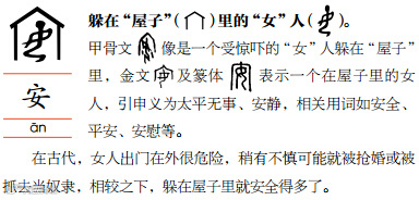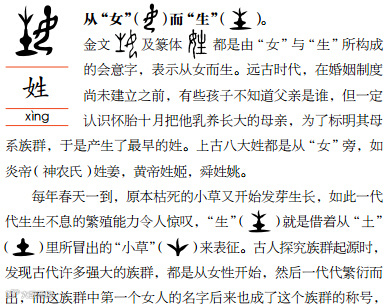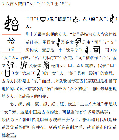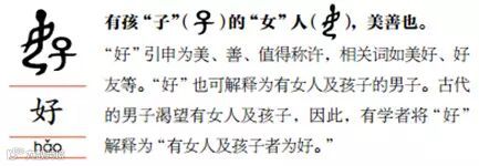人人都由女性所出,“女”因此也含有孕育万物的含义,相关的衍生字如始、姓等都具有“生养族群”的意义。除此之外,古人也认为生孩子是女子的“天职与渴望”,也更注意女人的安全,因此有了好、安等字。
