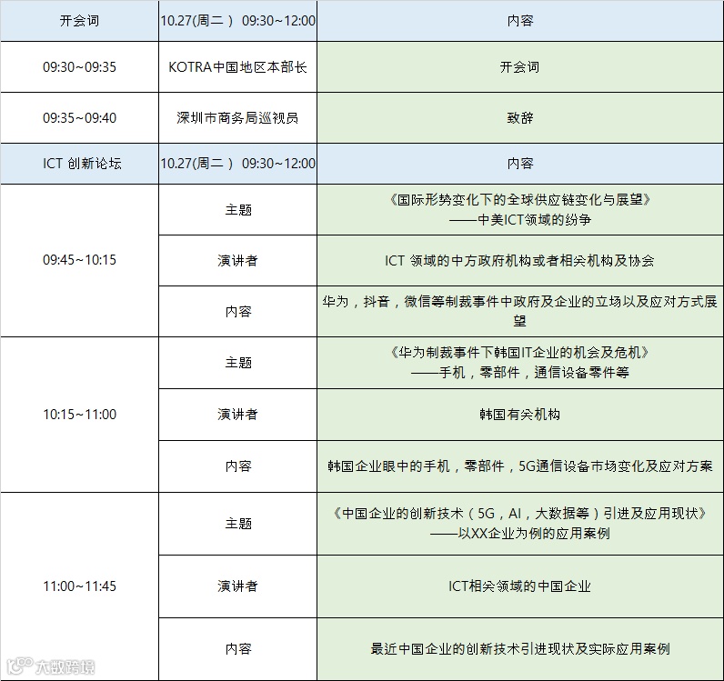 鉴于目前新冠状病毒(COVID-19)的爆发,为最大限度减低疫情对中韩俩国企业间合作往来的影响,大韩贸易投资振兴公社(KOTRA)特于疫情期间开展中韩ICT论坛(线上线下同时进行)及1对1线上视频洽谈,在此诚挚邀请贵公司参加此届洽谈会。以促进双方企业的合作及发展, 共享“双赢合作”机会。