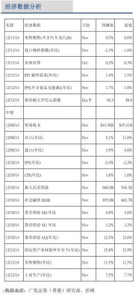 本周主要是关注内地的经济数据公布,包括本周一公布的出口及进口数据,市场预测11月份内地进出口增速会放缓。另外,本周三内地公布PPI及CPI数据,市场预测11月份CPI维持在1.6%。与此同时,内地公布货币供应数据M1、M2。除了经济数据外,投资者亦关注本周内地举行的中央经济工作会议。