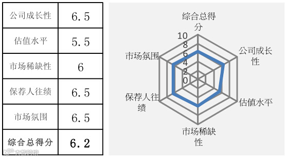 综合评分总得分 =(市场氛围评分 + 公司成长性评分 + 估值水平评分 + 市场稀缺性评分+保荐人往绩评分)之平均数