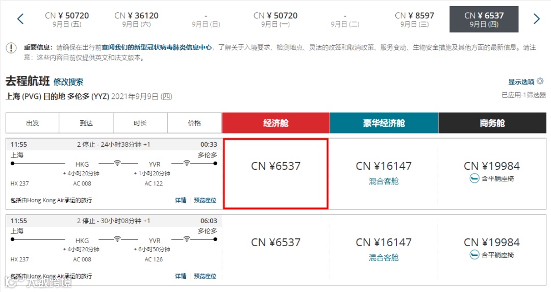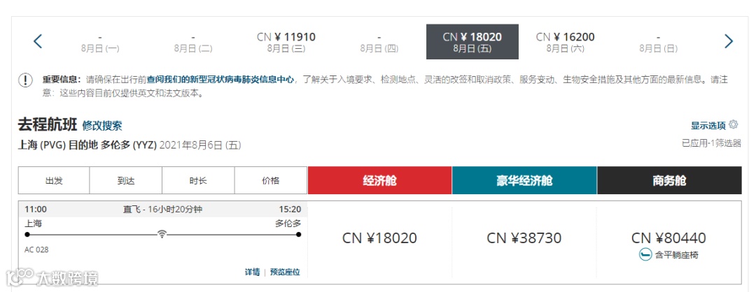 随着今年9月恢复返校上课,近期大量的留学生开始陆续返加,根据各个航空公司的票价查询结果,8月-9月中国飞多伦多的机票贵到离谱,而且直飞的航班极少,经济舱单程票价最高超过3万人民币。