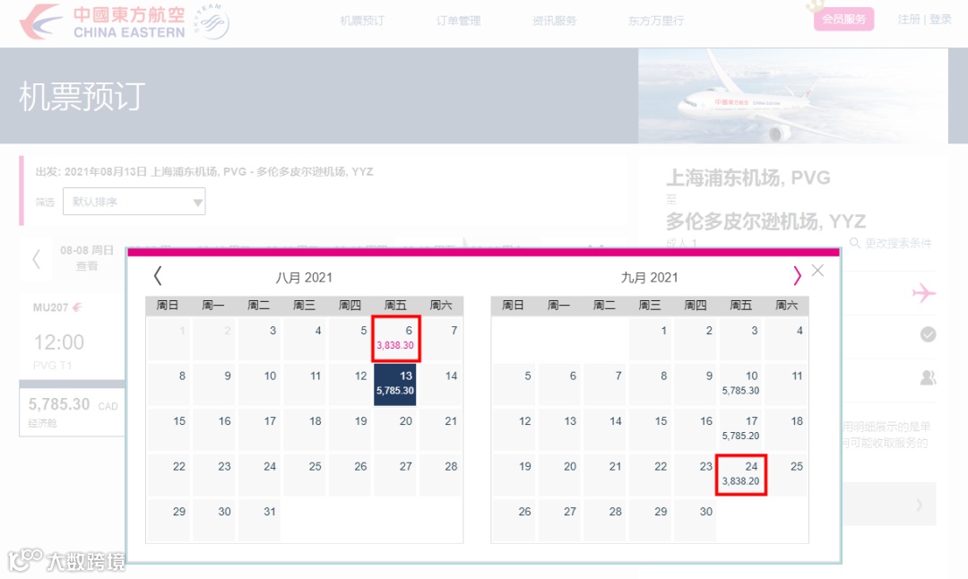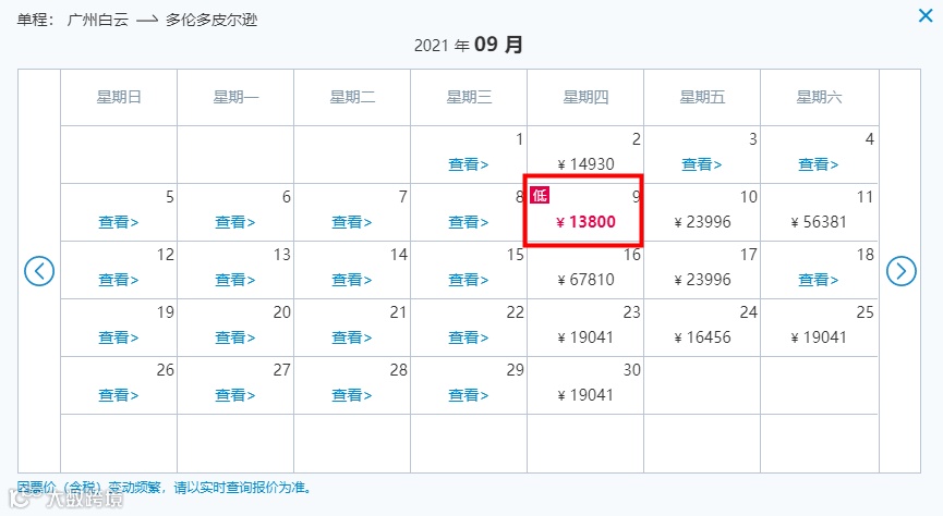 上海飞多伦多的经济舱机票数量非常少,最低价出现在9月,人民币6,537元(约$1,307加元,需要中转两次),最高人民币18,020元(约$3,604加元,直飞)。