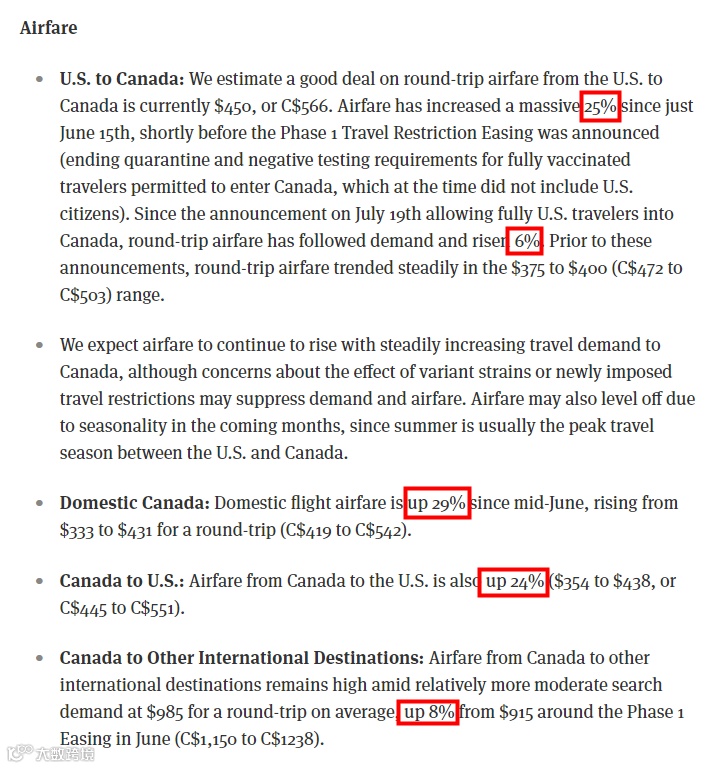 从美国飞往加拿大的航班搜索量每日激增31%,航班预订量(包括单程和往返)增长168%,票价在6月15日至-7月18日期间“大幅”攀升了25%,在7月19日之后加拿大政府确认符合条件的完全接种疫苗的美国旅行者可以出于非必要目的前往加拿大,票价又上涨了6%,当天的预订量更是暴涨了132%,创下自大流行以来的最高单日预定,超过每周平均水平的两倍。