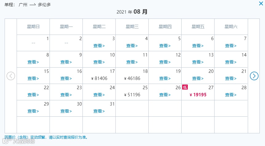 广州飞多伦多单程票价最低人民币13,800元(约$2,760加元,中转两次),最高人民币23,996元(约$4,799加元,直飞)。