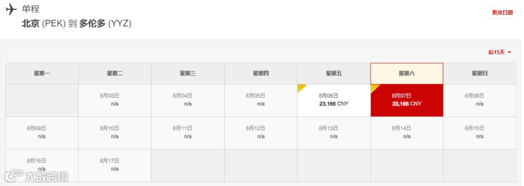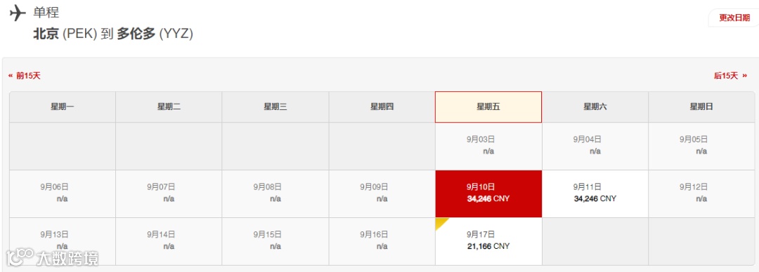 北京飞多伦多单程票价最低人民币21,166元(约$4,233加元,中转一次),最高人民币34,246元(约$6,849加元,中转一次)。