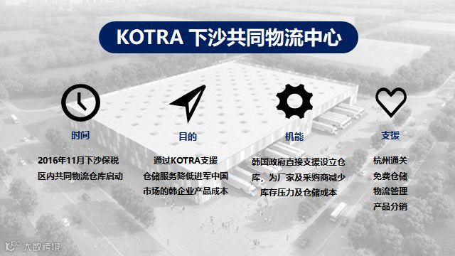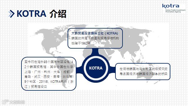 大韩贸易投资振兴公社(KOTRA)是韩国政府属下非盈利贸易促进机构,旨在促进韩国与海外地区的经贸交流,是各国经济与韩国经济联系的桥梁