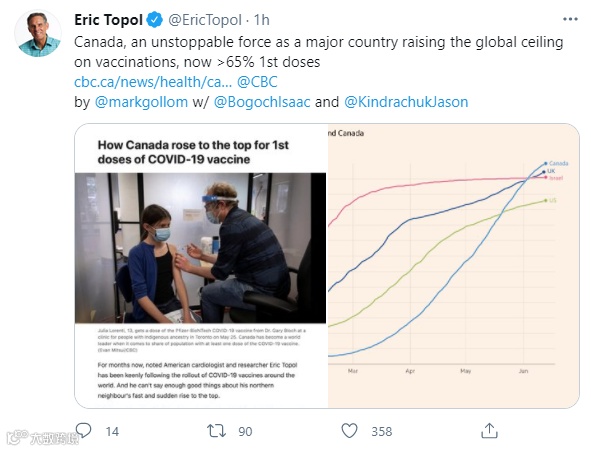 Topol发布了一条推特说:“加拿大,是一股不可阻挡的力量,是提高了全球疫苗接种率上限的主要国家,现在第一剂接种率已经超过65%。”