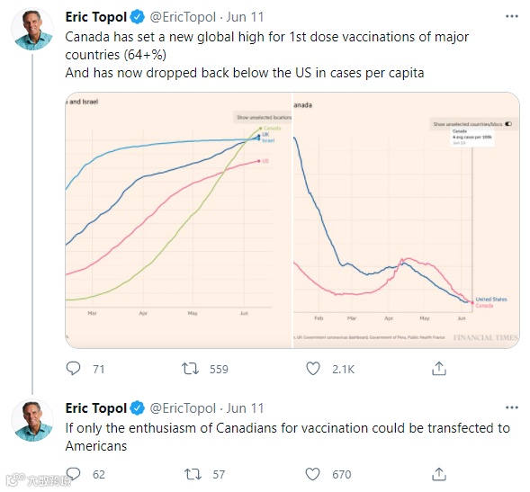 最近几个月,著名的美国心脏病学家和研究院Eric Topol一直在密切关注COVID-19疫苗在全球的接种情况。而且,他对北边的邻居加拿大,用尽了赞美之词。