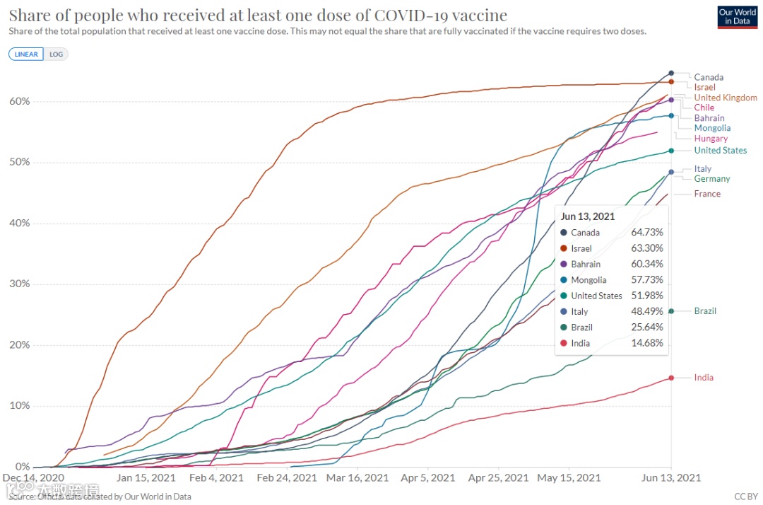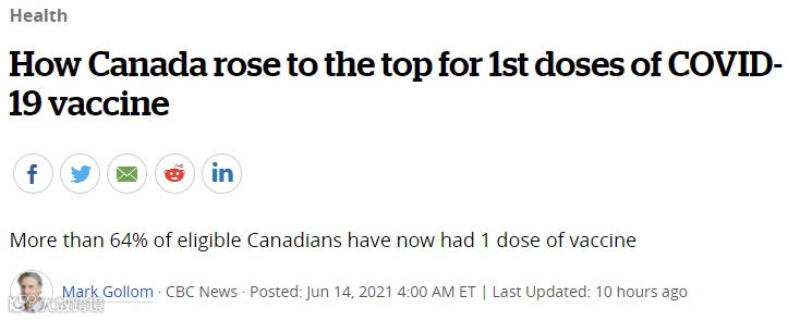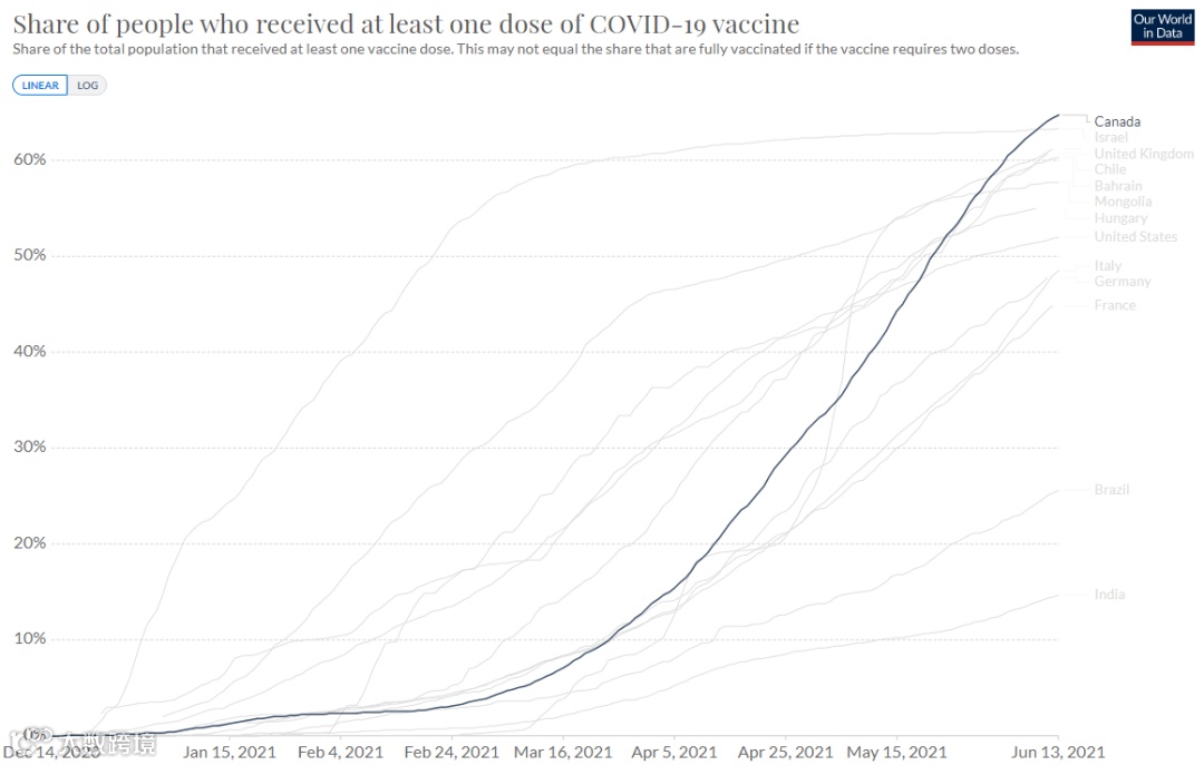 根据在线研究出版物《Our World in Data》的数据,截至6月13日,加拿大已经向超过64.73%的国民接种了至少一剂疫苗,超过以色列的63.3%,位居全球榜首。