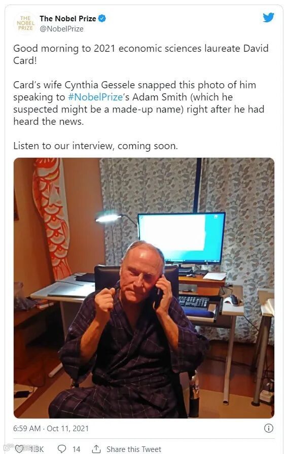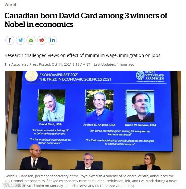 Card因其关于最低工资、移民和教育如何影响劳动力市场的研究获得了一半奖金。另一半则是由麻省理工学院的61岁教授Joshua Angrist和斯坦福大学58岁的荷兰裔教授Guido Imbens两人分享。