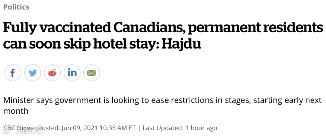 加拿大卫生部长Patty Hajdu6月9日宣布:从7月初开始,已接种两剂新冠疫苗的加拿大公民、永久居民和必要工作人员入境加拿大后不再需要隔离14天,也不再需要住进隔离酒店。