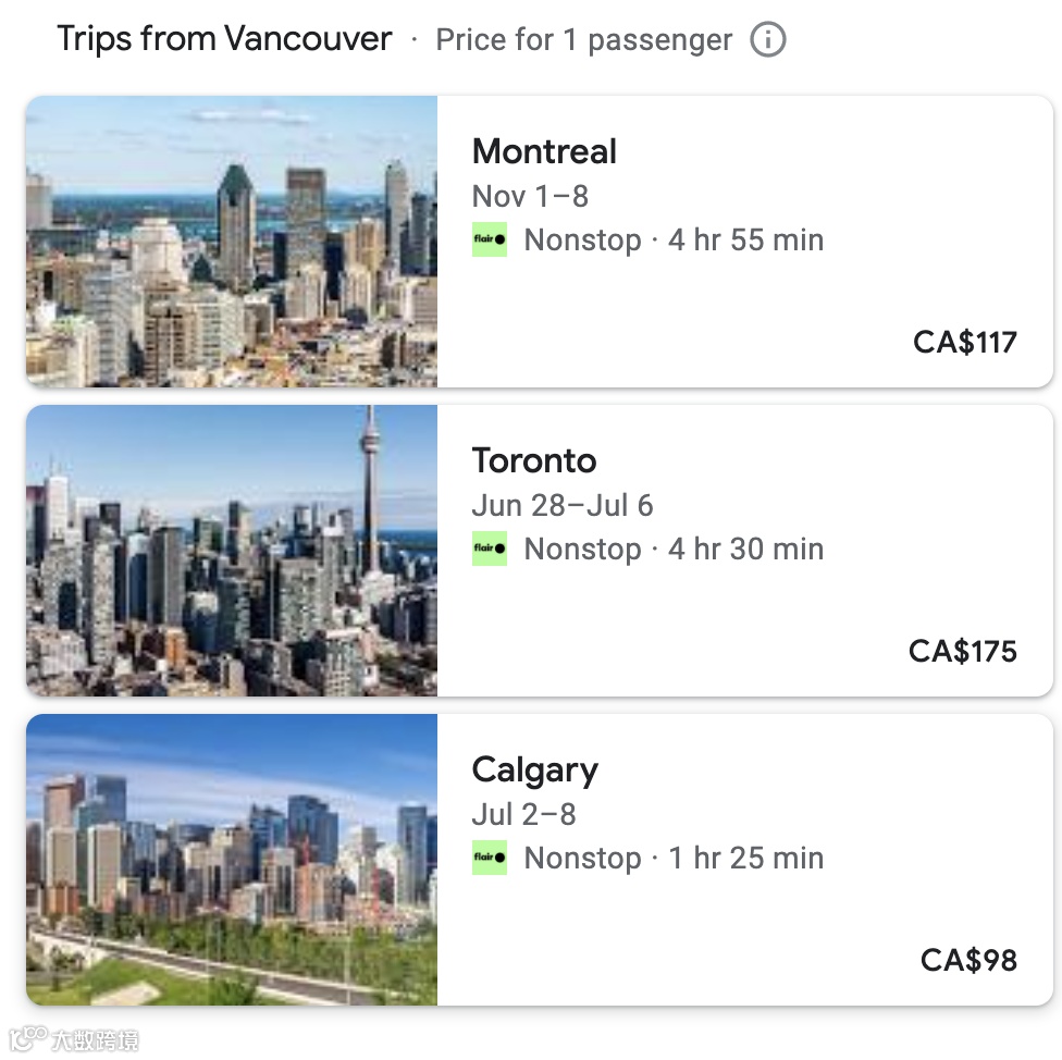 搜索加航和西捷航空两家公司的网站,会发现今年夏天从温哥华飞往蒙特利尔的单程票价仅为$117,从温尼伯飞往卡尔加里的票价甚至低于$90。
