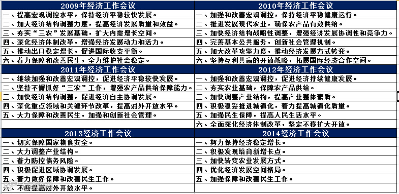 本次会议再次将“保持经济稳定增长”放回到了首要工作任务之中(2009年到2012年,每一年经济工作会议都会把经济增长放在首要工作任务,但在2013年却并没有把经济增长放在工作任务里去,而是强调“控风险、调结构”,去年的两次“钱荒”也让投资者一度认为政府愿意忍受经济增速的大幅下滑来实现经济结构的调整,因此需要通过高利率倒逼企业去杠杆)。并且强调要继续维持积极的财政政策和稳健的货币政策,这意味着不必再担心会以牺牲经济增长来“调结构”,明年的政策仍有进一步宽松的空间,财政政策方面预计财政赤字会有明显提升,货币政策方面预计仍有进一步的降息降准空间。