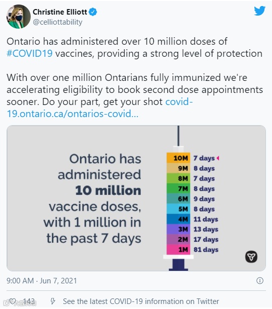 “超过100万安大略人已完全免疫,我们正在加快第二剂疫苗预约的进度。尽自己的一份力量。”她在推特上说。