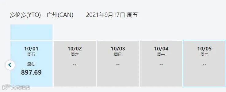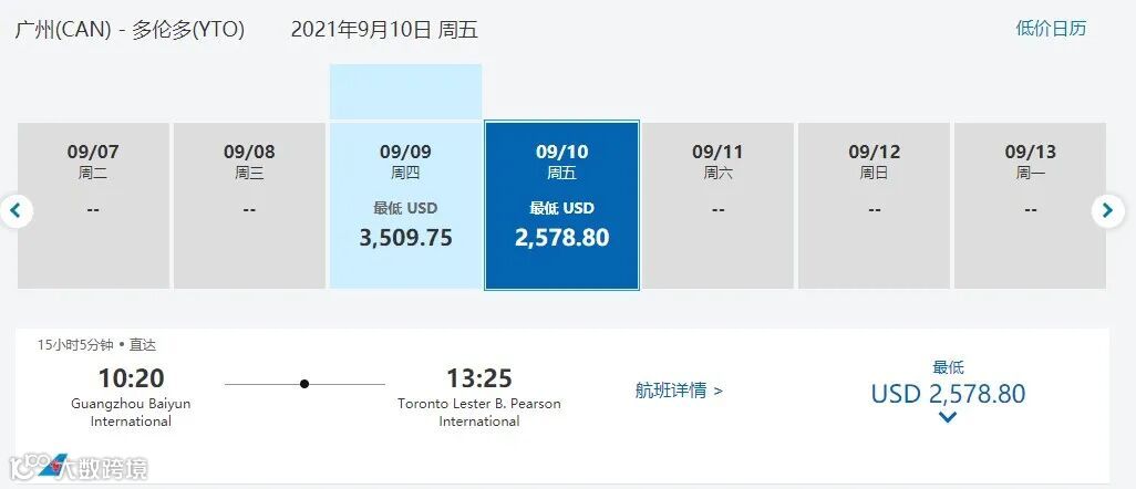 根据南航官网显示,由于目前正值开学季,所以广州直飞多伦多的机票价格非常高昂,下周五(9月10日)单程机票最低为$2578.80美元,约$3230加元,约16642人民币。