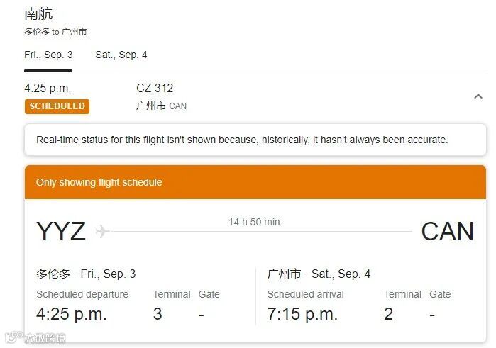 多伦多-广州 CZ312 16:25-19:15(+1)