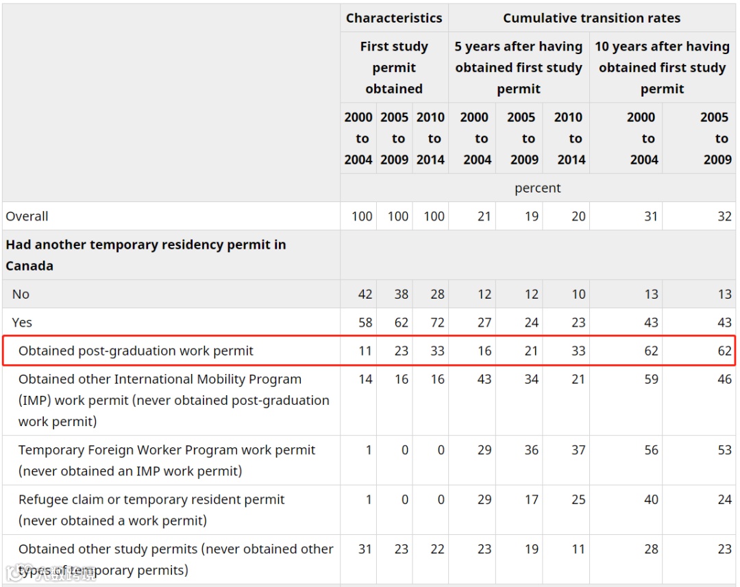 数据显示,那些申请PGWP的留学生在首次获批学签的十年内转化成PR的比例为62%!是整体留学生PR转化率的2倍以上!