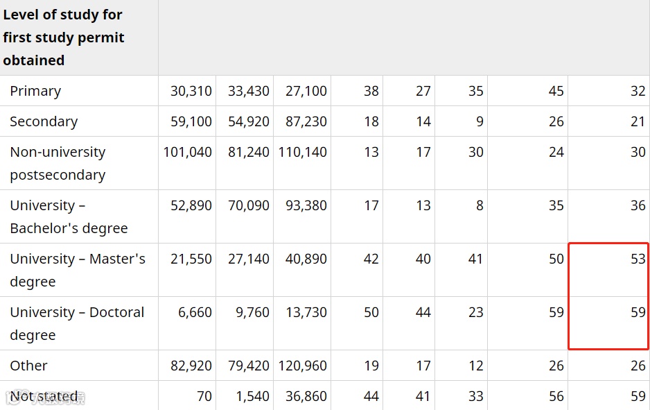 首次获得学签的留学生年龄大多集中在18岁至24岁之间,这个群体在获批首次学签十年内的PR转化率为31%。