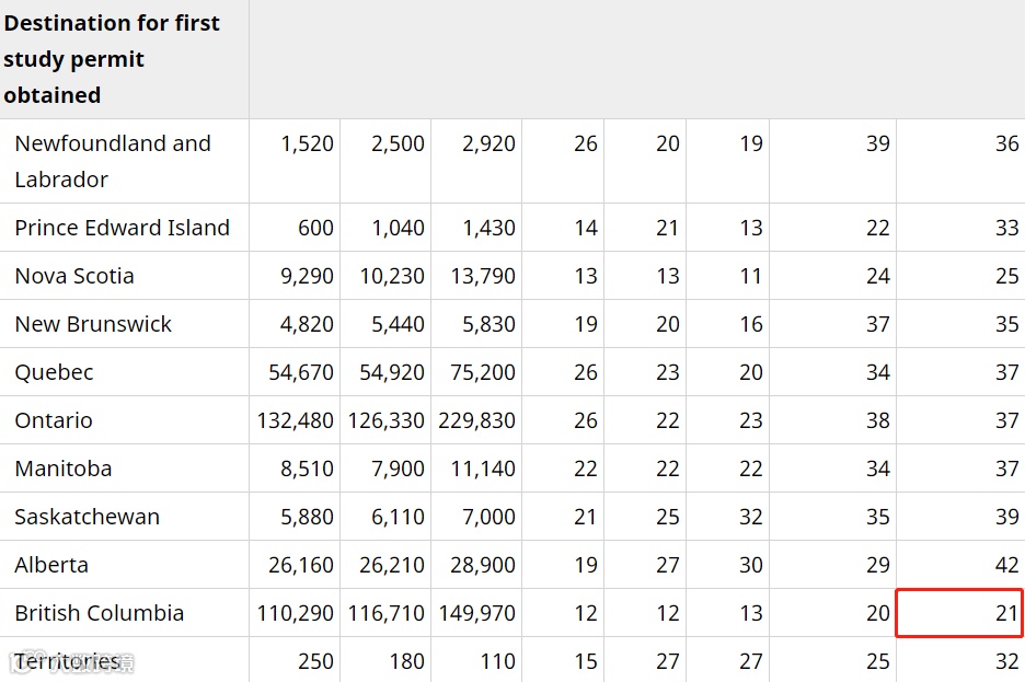 而那些首次申请学签是在BC省读书的留学生在十年内拿到PR的比例最低,为21%!