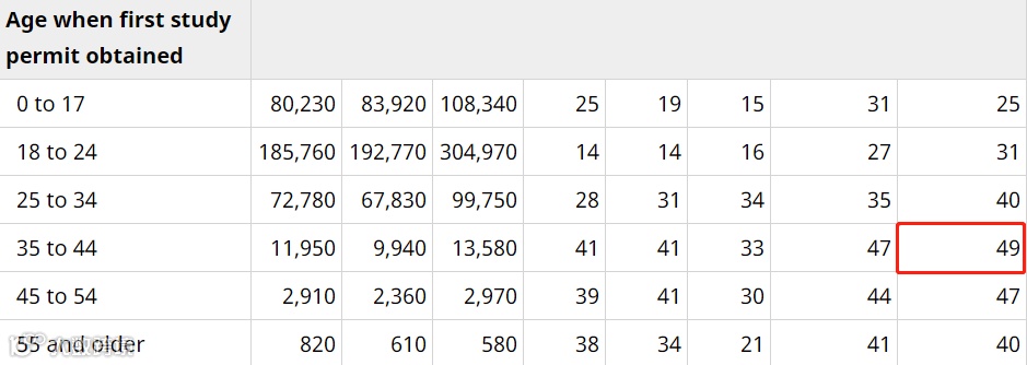 在35-44岁首次获批学签的留学生中,有49%成功在来到加拿大的十年中拿到PR身份。
