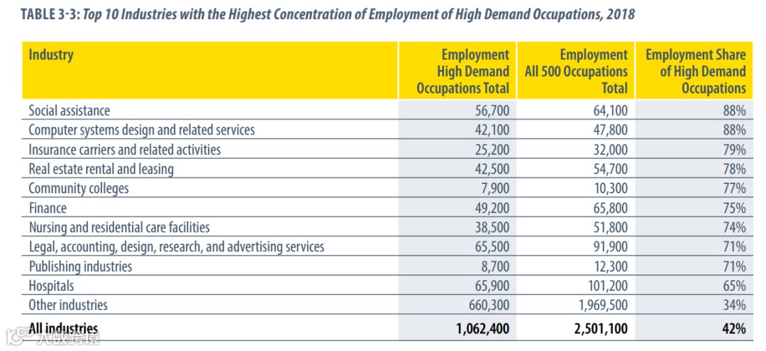 社会援助、计算机系统设计及相关服务、保险、房地产、社区学院、金融、护理及相关看护设施、法律、会计、设计、研究和广告服务、出版业。