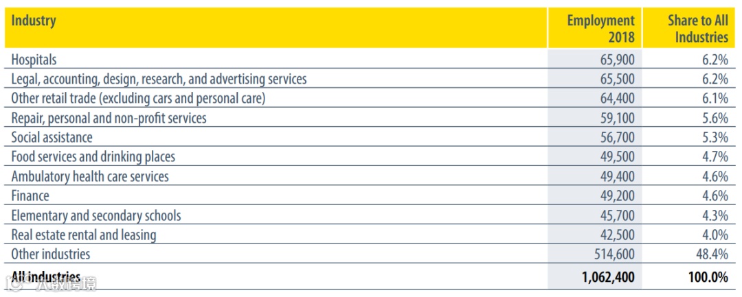 医院;法律、会计、设计、研究和广告服务;零售贸易;维修、个人非营利服务组织;社会救助;餐饮服务;门诊、医疗保健服务;金融;中小学校;房地产。