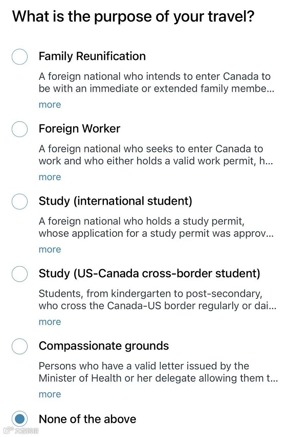 留学生/工签/家庭团聚/美加学生/人道主义考虑(在加亲友病重、病危、奔丧者)/加拿大公民或PR,选NO(加拿大护照或枫叶卡选择None of Above)↓
