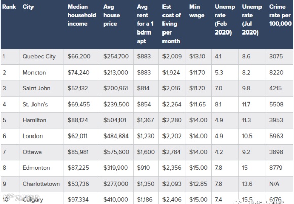 如果你正在寻找整体生活成本最低的城市,我们的前三名城市(来自我们的前10名名单)是蒙克顿、魁北克市和圣约翰。看中最低的房价?圣约翰、蒙克顿和圣约翰在我们前10名中的平均房价是最实惠的。