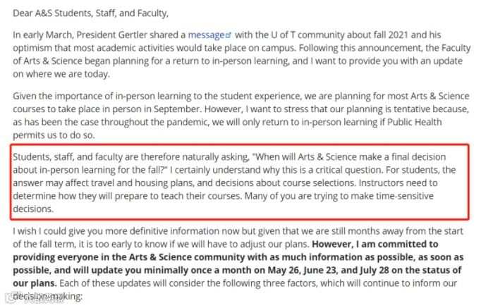 近日,多大再次对早前的声明做出更新,在安全的情况下,校方的计划和之前保持一样,将在9月恢复大部分的线下授课。后续的决定会在5月26日,6月23日,7月28日再次更新。