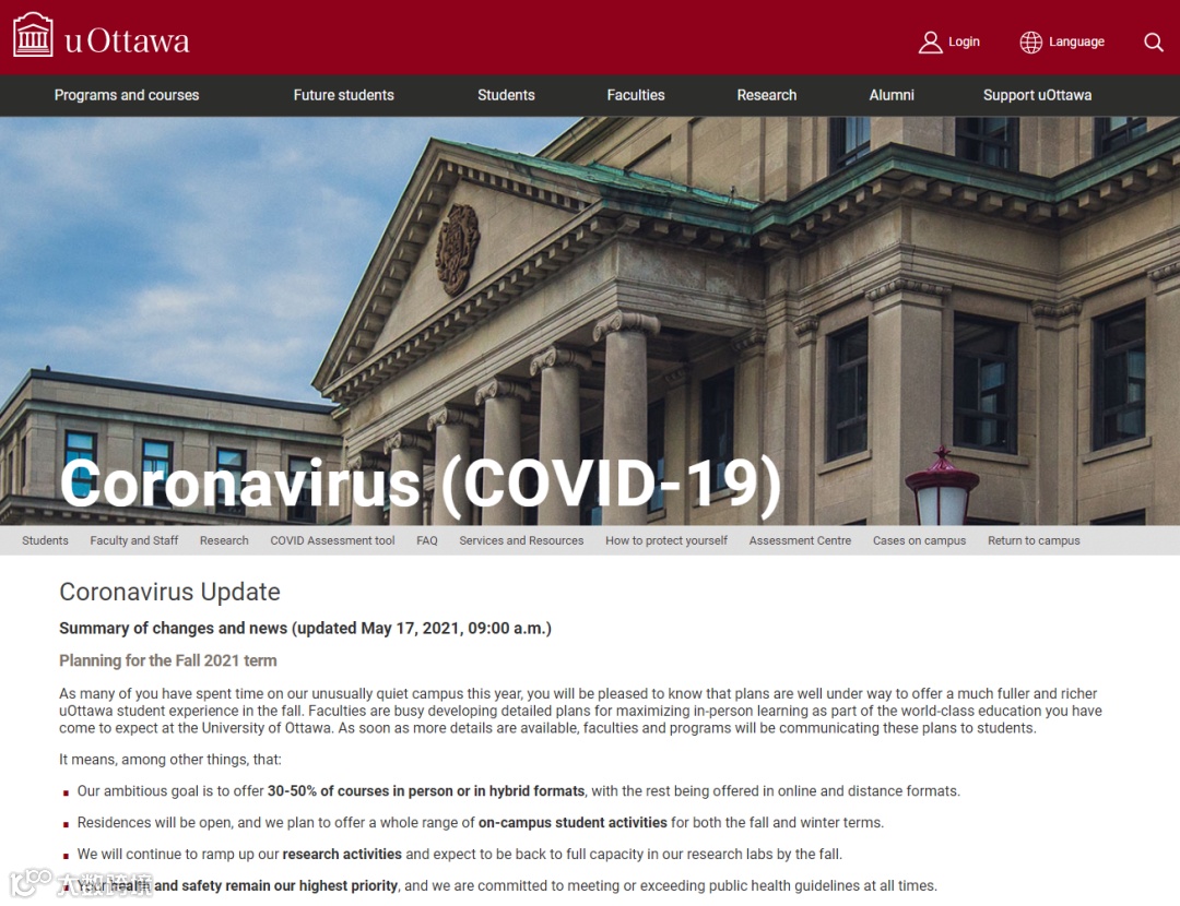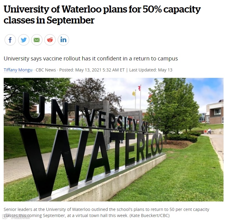 滑铁卢大学在5月13日宣布,目前疫情的加速接种让校方对重返校园充满信心,今年9月将有更多课程恢复线下,每节课计划以50%的容量上课。