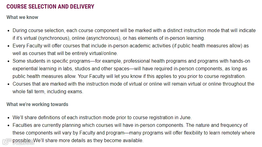 一些特殊的项目,例如健康类的项目以及需要Lab和Studio的实践类项目,将会在允许的情况下恢复线下。这些学院会在大家选课之前告诉大家具体的信息,标有Virtual或Online的课程,