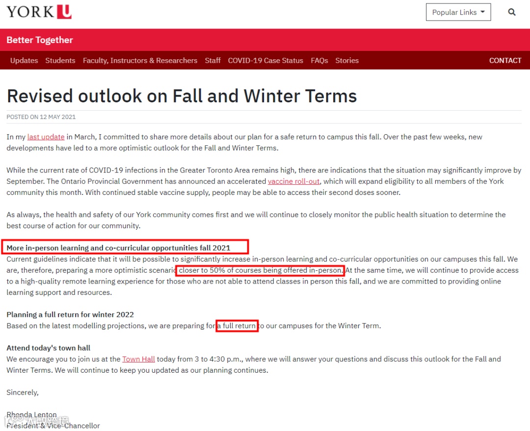 约克大学在5月12日宣布,随着疫苗的大面积接种,校方正在准备更加乐观的方案,约50%的课程计划在9月恢复线下,同时也将继续为无法返校的学生提供高质量的远程学习体验。