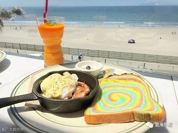 配上蔬菜沙拉,还有培根煎蛋,一小片彩虹面包,低热量又健康的搭配,再加上镰仓的海岸和蓝天,简直就是梦里最完美的下午茶。