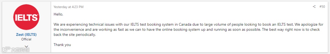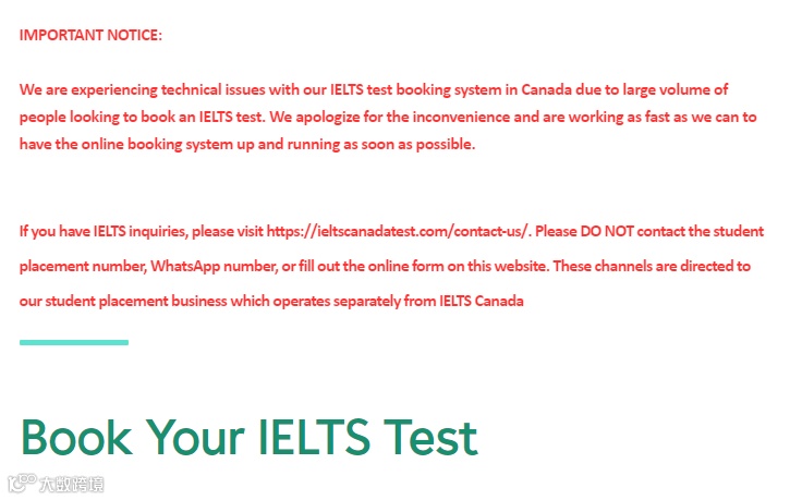 就连雅思官方也不得不出面解释:因为要预约雅思考试的加拿大考生太多,我们的考试预约系统遇到技术问题,目前大家能做的最好方法就是定期检查预约通道是否能够预约成功。