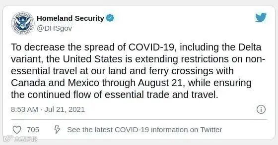 由于德尔塔(Delta)变异毒株,美国政府延长和加拿大的陆路和渡轮过境点的非必要旅行的限制至8月21日。