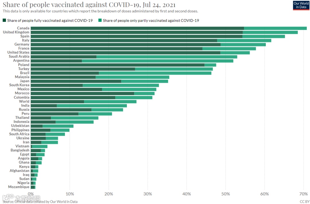 据Data in Our World数据,截至7月24日,加拿大的COVID-19疫苗接种率,无论是一剂还是两剂,都已经超越世界主要国家,稳稳坐在了第一的位置上。