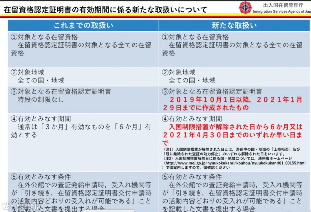 ①持有在留资格认定书但未来得及入境日本的,原本在留资格认定书的有效期是3个月,但只要是2019年10月1日到2021年1月29日之间发行的认定书,有效期将延长到入国限制措置结束后的6个月为止,最长到2021年4月30日为止, 哪个早按哪个时间来算。这一点对2020年7月或10月留学生来说,比较重要。