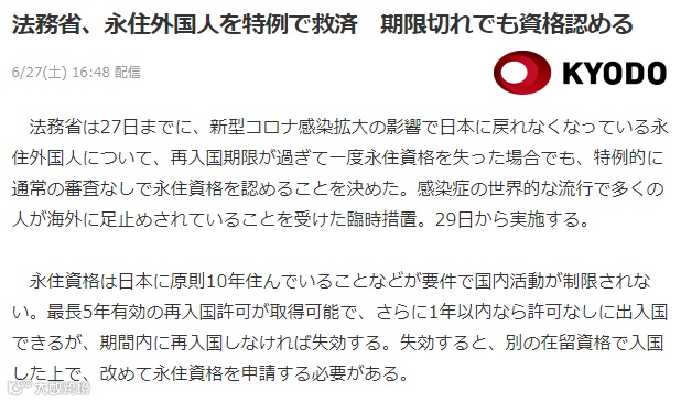 因为疫情影响,永住签证持有者在“再入国期限”内没有来得及返回日本,将作为特例无需通常审查就承认其永住资格。简单地说,就是永住资格会被保留。这鉴于因疫情全球流行而实施的临时补救措施,于6月29日起生效。