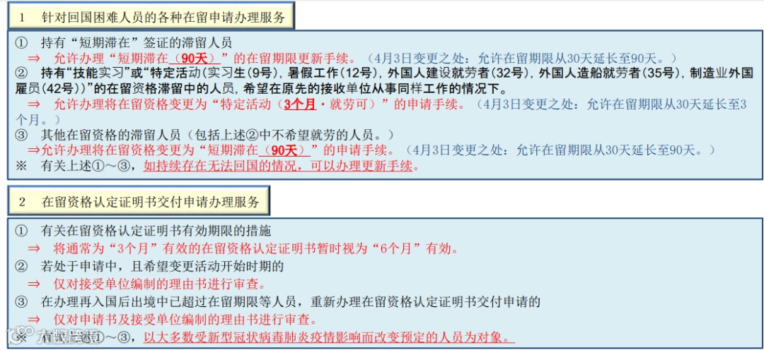 除了上面提到的无法在期限内返回日本的人员以外,对于一些在留到期但因为疫情影响不得不滞留在日本的人员,日本入管局也放宽了限制。