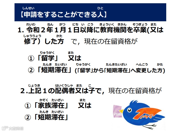 对于大家都关心的留学生群体来说,针对在2020年1月1日之后毕业的留学生,可以把留学签证更换为短期滞在签证,需要注意的是,这个签证不能打工。但是如果想打工的话,也不是没有办法,需要更换为特定活动签证。
