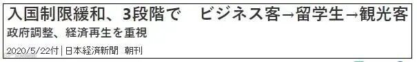 先前,为防止新冠肺炎扩大而实施的入境限制举措,日本政府开始拟三段式放宽入境限制:首先放宽商务工作人员,其次是留学生,最后是观光游客,接下去视国内外感染情况逐渐扩大对象范围,恢复经济问题。