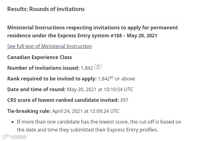 加拿大当地时间2021年5月20日,联邦快速移民通道Express Entry第188次邀请分数397,邀请1842人。此次抽选是针对CEC加拿大经验类的申请人。