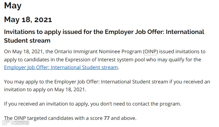 加拿大当地时间 2021年5月18日,安省移民局公布首次留学生类别技术移民抽选结果,最低分数为77。