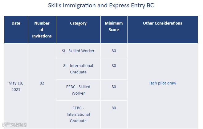 加拿大当地时间 2021年5月18日,BC省移民局公布新一轮技术移民 (仅针对29个特快审批职业) 抽选结果:本轮抽选共计发出82份邀请, 常规雇主担保类项目抽选分数线80分, 所有类别分数线与上期一致。