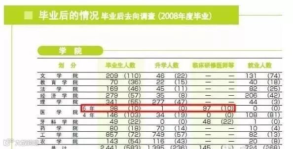 日本医院对于医生晋升没有SCI、课题或者基金数量方面的要求。上面是日本某帝国大学(约等于中国985院校)2008届毕业生的毕业去向,该届临床医学专业的学生一共98人,只有1人选择了继续深造,其他人毕业后都直接工作了。当然,如果在中国,本科毕业后都能找到一份好工作,估计读研的人数也会大幅下降。