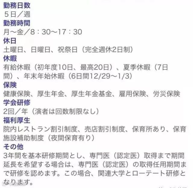 上面是山形县一家私立医院的研修医招聘通知,年收入第一年是770万日元(约合43万人民币),以后逐年递增,值班费、交通补贴、住房补贴等补贴另外支付,每天工作时间从8:30~17:30,周末双休,有保险和年金,每年由医院提供至少两次参加学会的机会,享受10~20天的带薪年假。