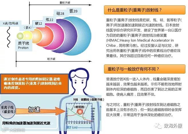 重粒子放射线应用于临床治疗以来,已成为医学界公认的最为先进的癌症治疗方法。日本是世界上重粒子线技术开展最早的国家、拥有治疗病例数最多、临床经验最为丰富的重粒子加速器中心。为使国内的患者也能享受这一最为先进的癌症治疗技术,基于森海行私人定制健康之旅与日本放射线综合研究所重粒子中心医院、群马大学重粒子研究中心独家合作关系,现在,中国公民也可以到日本去享受世界最先进水平的癌症治疗服务了。癌症肿瘤患者赴日本主要选择重粒子线治疗。重粒子线适合治疗头颈部肿瘤(鼻及面部等耳鼻科)、头盖底肿瘤、非小细胞肺癌、纵膈肿瘤、肝癌、胰腺癌、肾癌、前列腺癌、子宫颈癌、转移性肿瘤、软骨部肿瘤。第一期肺癌及早期肝癌只要1~2次照射即可完成治疗,骨瘤虽要照射16~20次,也只有X射线次数的一半。每次照射治疗只有约1~2分钟,无任何疼痛感,基本上没有任何感觉。不适合者也可选择其它治疗,如螺旋导航光子刀等。
